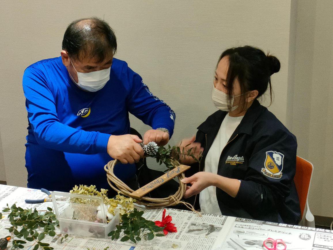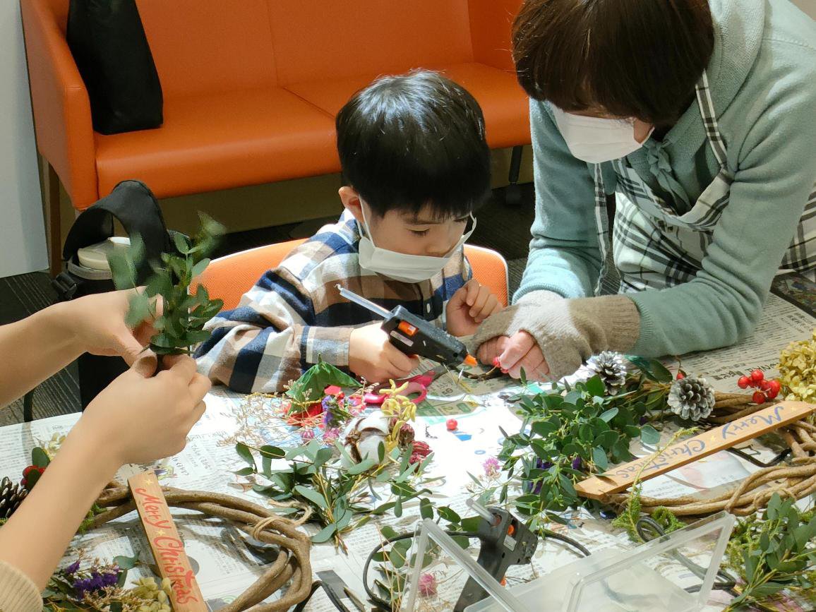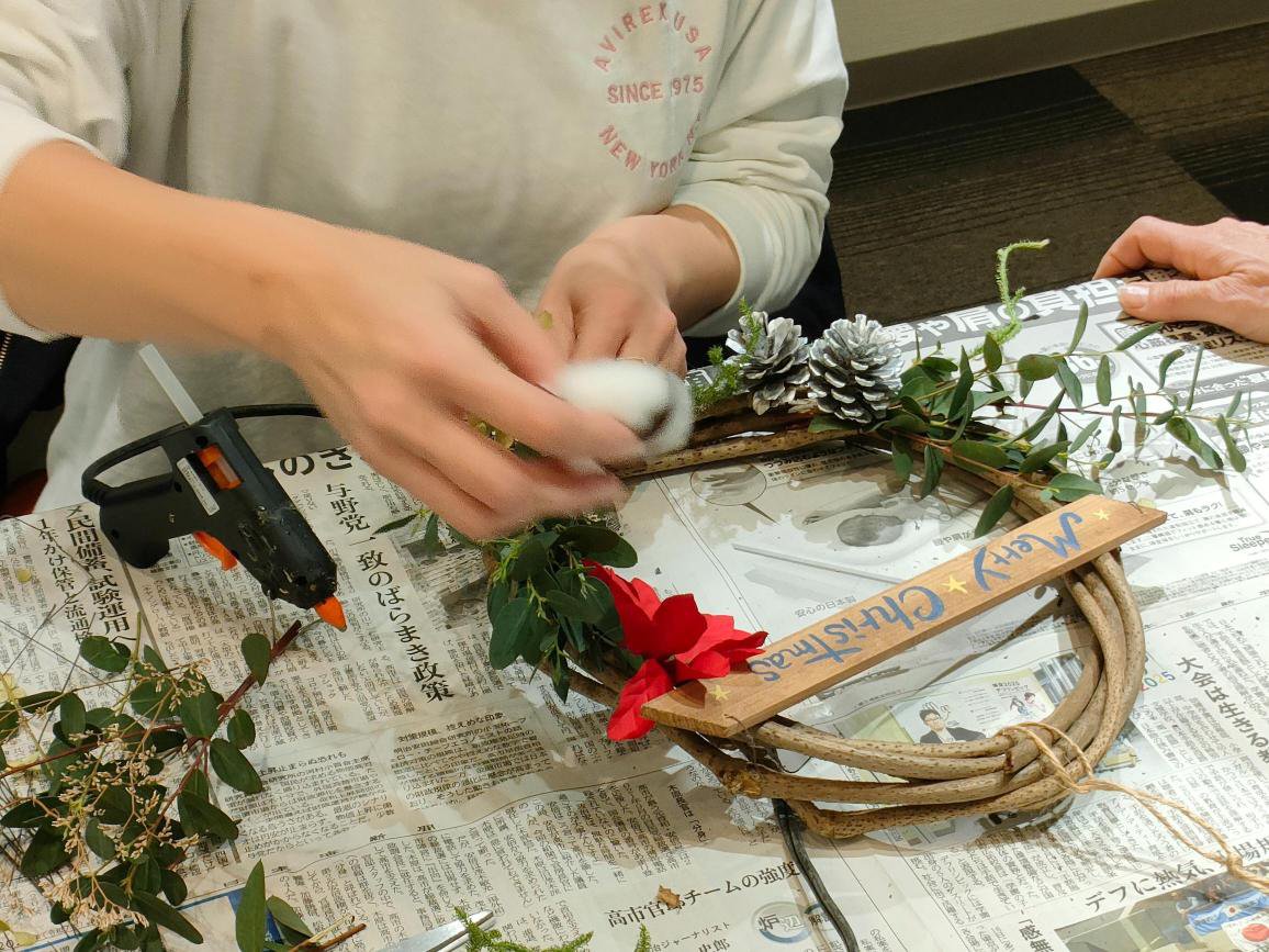 11月のテーマは「クリスマスリース作り」です。佐治町で活動されているクラフト工房からお二人の講師をお招きし、クリスマスに向けて比較的簡単にでき、自宅に飾ってもらうクリスマスリースを作るワークショップとおしゃべりを楽しむ交流会でした。